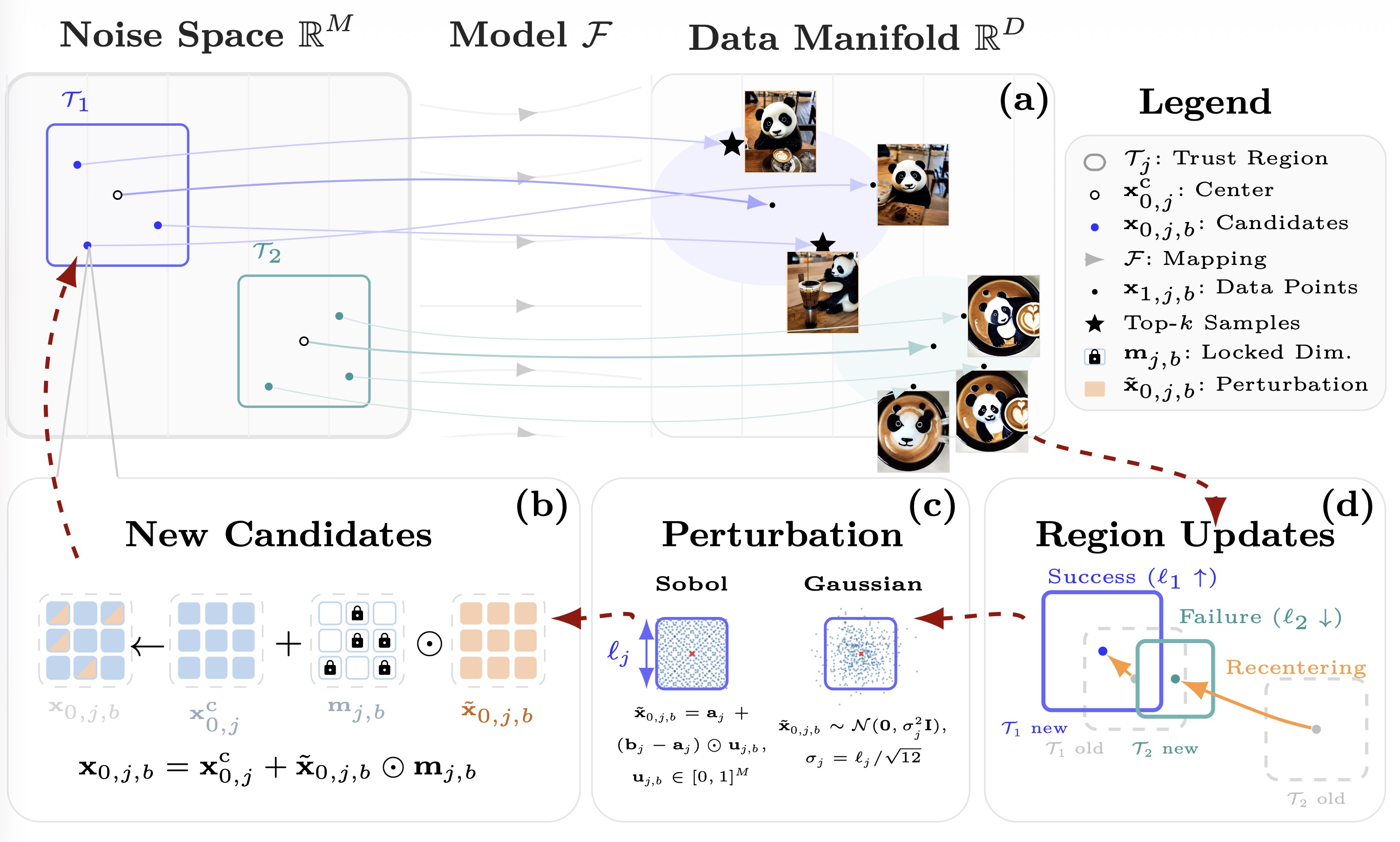 TRS treats the generative model and the reward function as completely opaque. Instead of updating model weights, it optimizes the source noise (the latent space) using a trust-region search. This makes it applicable to non-differentiable rewards and avoids the catastrophic forgetting associated with full fine-tuning.
